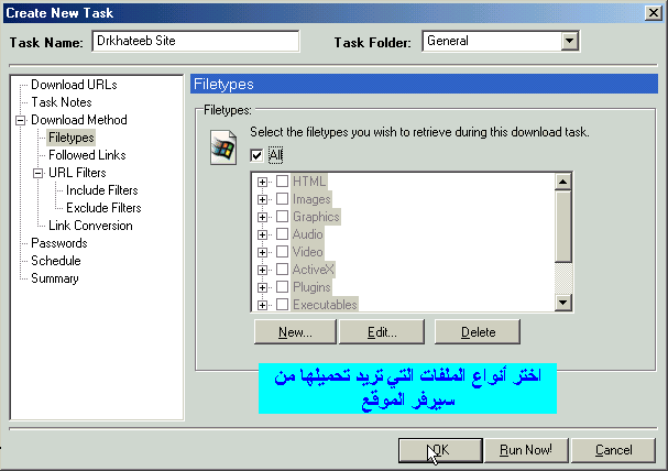 بعد تحديد الإعدادات العامة للبرنامج نقوم بتحديد مهمة تحميل موقع جديد أو صفحات محددة